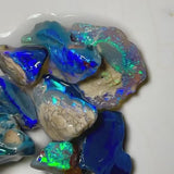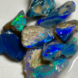 A bold parcel of Lightning Ridge black and dark opal rough, showing very bright blue and green fire throughout. Stones vary in shape and thickness, offering several face-ready pieces with strong directionality and dark contrast. A top option for cutters chasing high-impact brightness with solid backing and classic Ridge colour appeal.