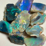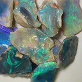 A solid Lightning Ridge parcel for cutters, featuring a variety of rough opal pieces with bright, mixed multicolour fire. Shapes and sizes vary, with several stones showing clear face potential and colour bar exposure. Some pieces are ready for careful shaping, while others invite exploration to uncover hidden fire.