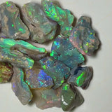 Fresh Lightning Ridge knobby opal rough showing very bright fire with great multicolour play. Colours are popping across the faces, with a lively mix of greens, blues, oranges, and more in several pieces. Solid bar structures and classic Ridge knobby character make this parcel a treat to explore and cut.