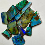 A neat little parcel of Winton boulder opal rubs and preforms, featuring nice face colour on most pieces. Tones lean toward greens, blues, and soft yellows, with a variety of shapes and sizes ready for fine cutting. Some are closer to finished rubs, others are still in rough or preform stage – ideal for custom shaping and detailed finishing.