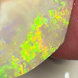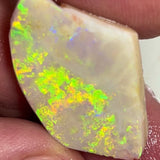 A gorgeous Lightning Ridge seam opal rub/rough with a large exposed face showing very bright multifires dominated by yellow and orange. Thin profile with strong play of colour, perfect for final shaping and setting. Excellent candidate for a high-dome pendant or statement gem with maximum colour impact.