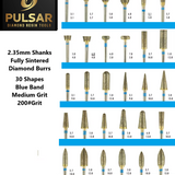 PULSAR DIAMOND® Full Set of 30 shapes 200#Grit Medium Blue Band Fully Sintered Diamond Burr 2.35mm Shank for grinding Opal & Gemstones, Glass, Stone, Metal Polishing Fits Dremel Foredom & Pulsar tools